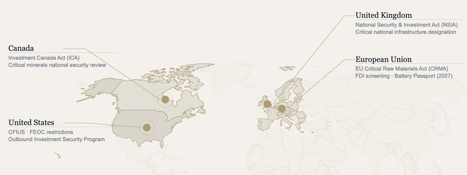 SITUATION – A lithium development company with a credible resource estimate and advanced permitting was seeking growth capital from sovereign-linked and state-influenced investors outside Canada at a time when the Investment Canada Act national security framework had been significantly tightened for critical minerals transactions.